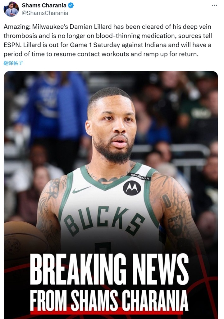 4月16日,Shams报道,利拉德血栓治疗取得重大进展,将缺席季后赛初期的比赛。