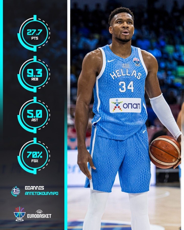 超级怪兽变态输出!字母哥欧锦赛场均轰下27.7+9.7+5 命中率近7成