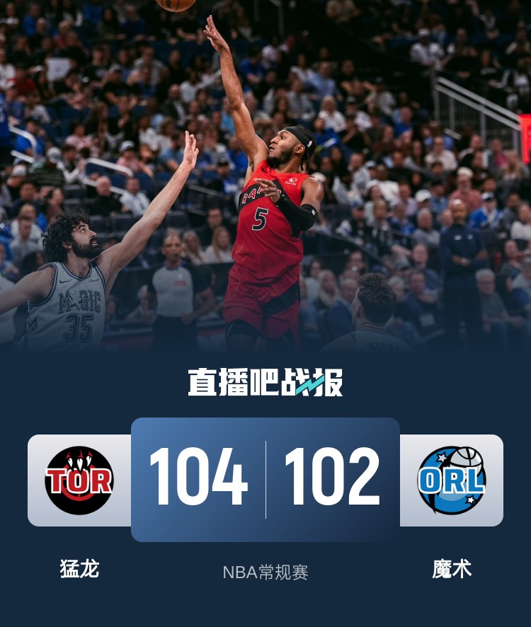 开场后两队都是选择冲击内线拿分,场上局面也是比较胶着,谢德突然爆发独得8分带领猛龙掀起一波攻势取得领先。第二节上来魔术外线找到手感追赶比分,猛龙总能及时回应三分,不过魔术在小瓦格纳的带领下还是在半场结束时追到只差1分,迪克受伤离场。易边再战,小瓦格纳上来帮助魔术反超比分,猛龙在巴雷特的带领下回敬攻势夺回领先,两队陷入拉锯战,三节结束前奎克利独得11分帮助猛龙拉开比分。最后一节上来猛龙延续攻势继续将分差拉大,小瓦格纳和班凯罗在最后阶段又帮魔术追到只差分,巴雷特发球失误,小瓦格纳错失绝佳空篮机会,最终猛龙104-102险胜魔术。