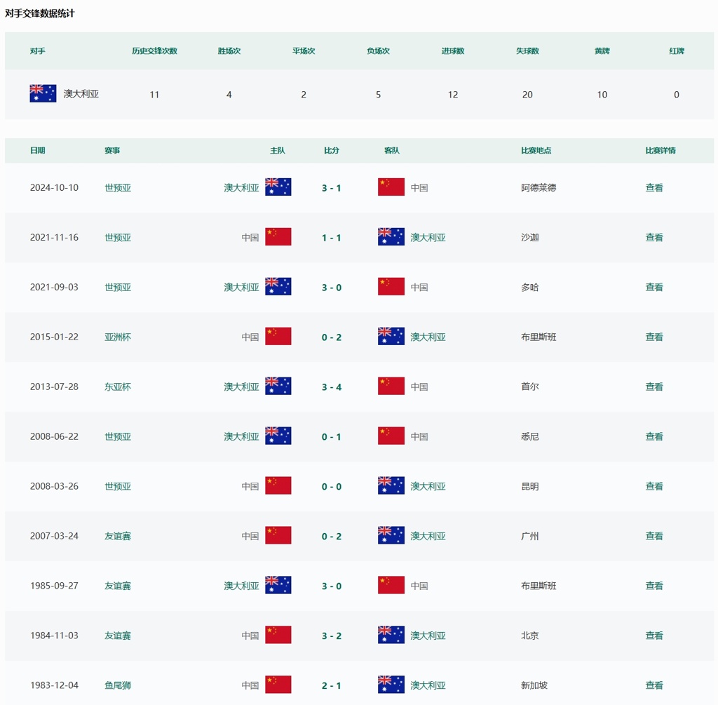 根据中国足协官网数据显示,国足共12次交手澳大利亚,取得4胜2平6负的战绩。