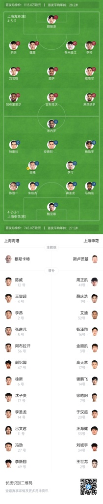 上海海港首发:1-颜骏凌、13-魏震、15-明天、32-李帅、40-吾米提江-玉苏普、10-马特乌斯-维塔尔(F)、22-马修斯-茹萨(F)、9-古斯塔沃(F)、26-刘若钒、30-加布里埃尔(F)、45-莱昂纳多(F)