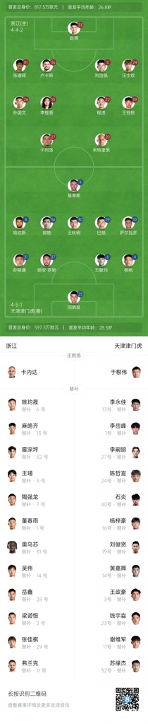 浙江vs津门虎首发:3外援PK4外援!王钰栋、米特里策、基莱斯先发