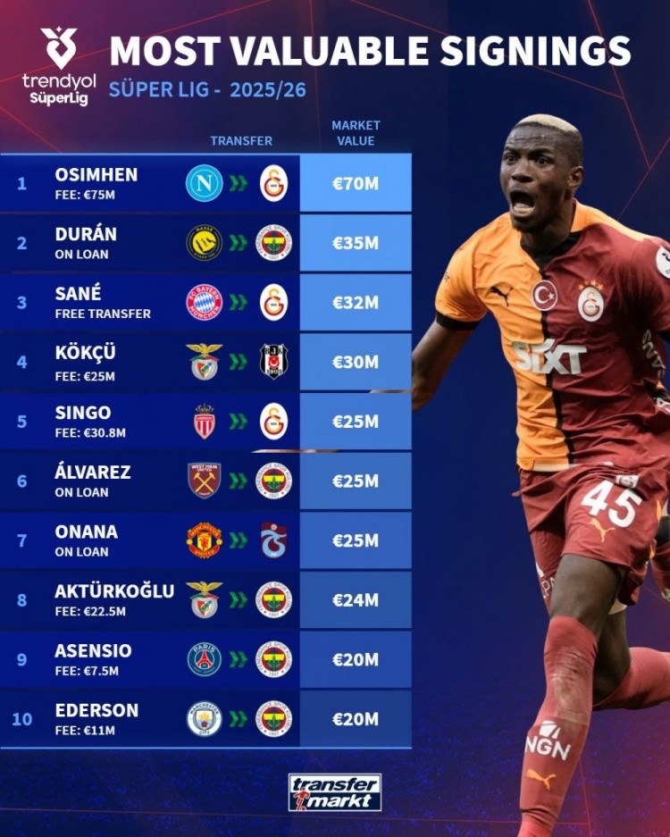 9月14日讯 德国转会市场统计了土超俱乐部今夏引进新援的德转身价,并列出土超今夏新援德转身价排名,奥斯梅恩7000万欧居首。